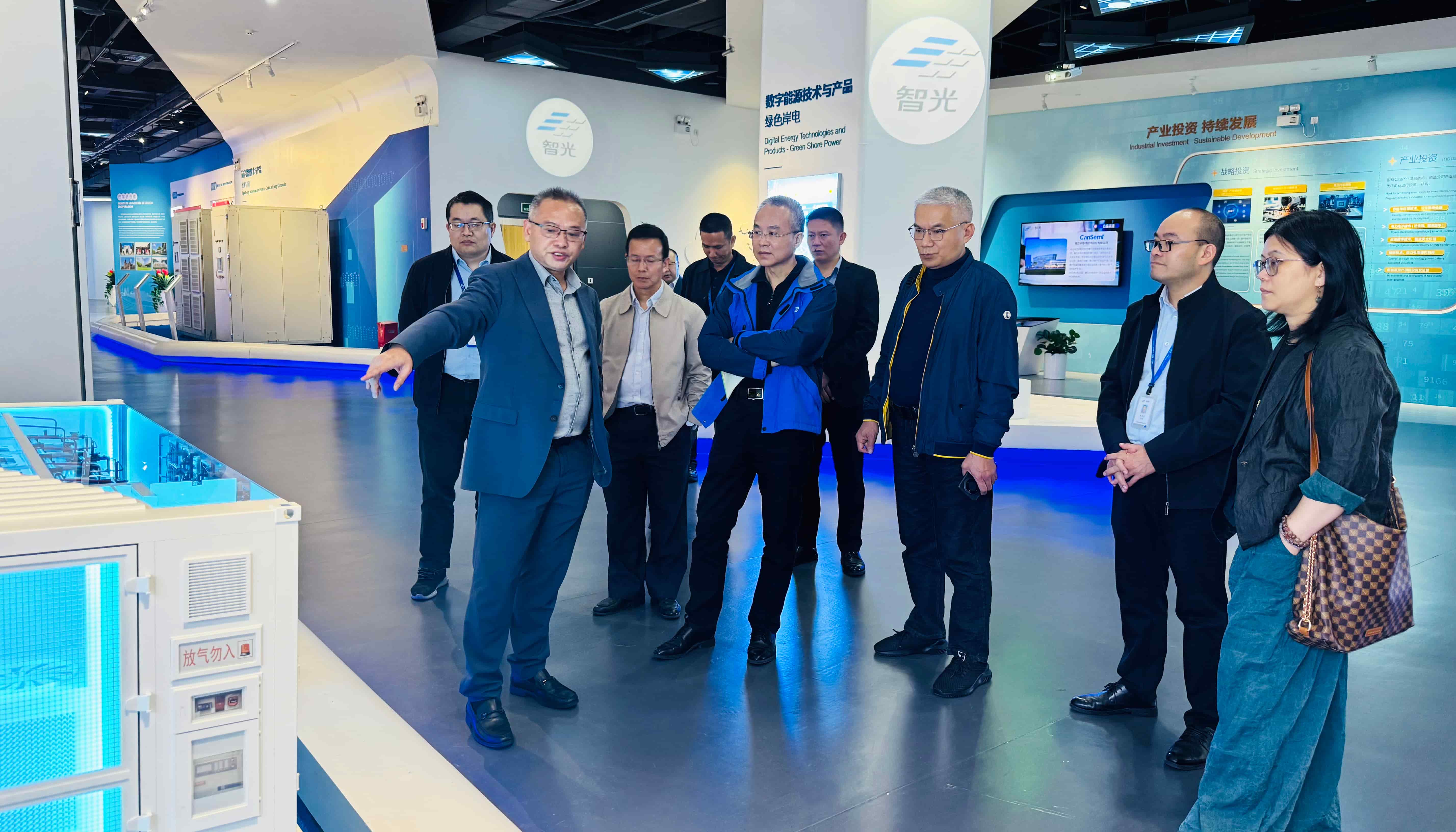 隨后,嘉賓一行前往智光綜合能源產業園,參觀園區展廳,詳細了解智光電氣在綜合能源服務、儲能系統集成和電力數字化等領域的技術成果、項目案例及產業布局,進一步加深了對智光電氣在新型電力系統建設中的技術積淀、創新能力與實踐經驗的全面認知。