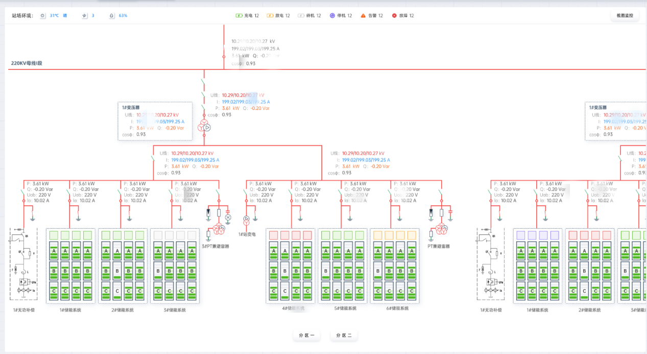 實時監(jiān)控儲能站關鍵設備包括PCS、BMS、冷卻系統(tǒng)、消防系統(tǒng)等運行情況,通過3D渲染等數(shù)字孿生技術顯示電芯電壓、溫度數(shù)據(jù),并進行實時溫差、壓差等分析,確保電站運行安全。