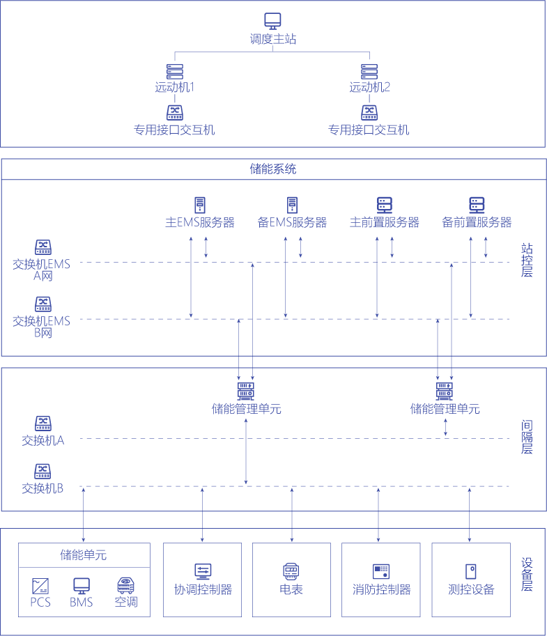 儲(chǔ)能EMS能量管理系統(tǒng)具備實(shí)時(shí)監(jiān)控、數(shù)據(jù)采集、數(shù)據(jù)處理、系統(tǒng)監(jiān)視、設(shè)備模型管理、事件順序記錄(SOE)、事件及報(bào)警處理、遙控遙調(diào)/能量調(diào)度AGVC/一次調(diào)頻、儲(chǔ)能運(yùn)行策略等功能。系統(tǒng)支持多種工業(yè)實(shí)時(shí)以太網(wǎng)協(xié)議、工業(yè)總線協(xié)議以及電力行業(yè)通訊協(xié)議,包括IEC104、IEC61850等;具備云邊協(xié)同能力和邊緣智能數(shù)據(jù)處理能力,具有完備的安全特性;具備靈活組網(wǎng)方案,覆蓋多種儲(chǔ)能站類型。