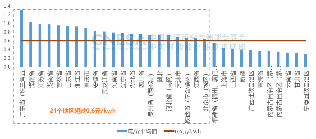 峰谷電價(jià)方面,2024年,32個(gè)地區(qū)最大峰谷價(jià)差的總體平均值為0.68元/kWh,同比-6.1%。對(duì)經(jīng)濟(jì)性保守測(cè)算下,按0.6元/kWh為收益邊界,21個(gè)地區(qū)滿足價(jià)差要求。